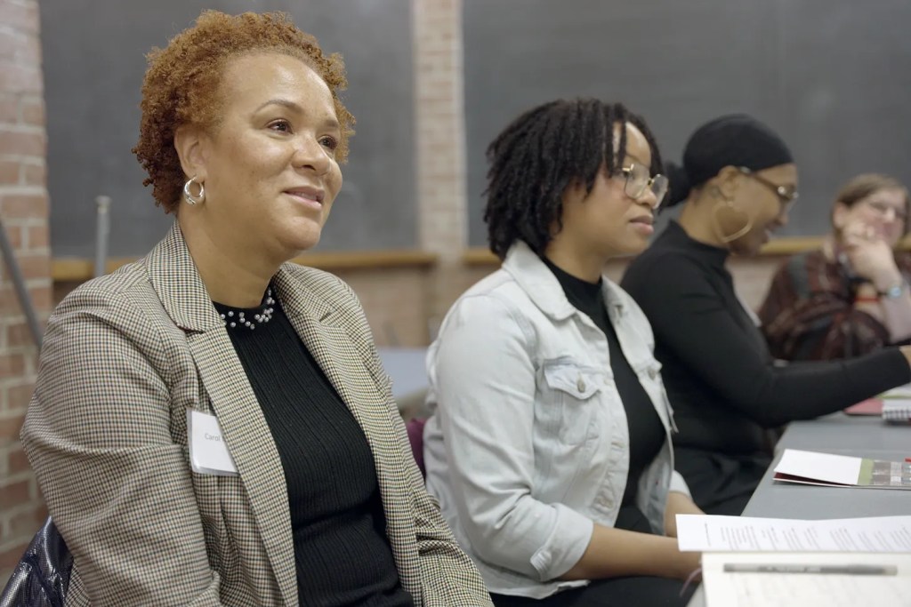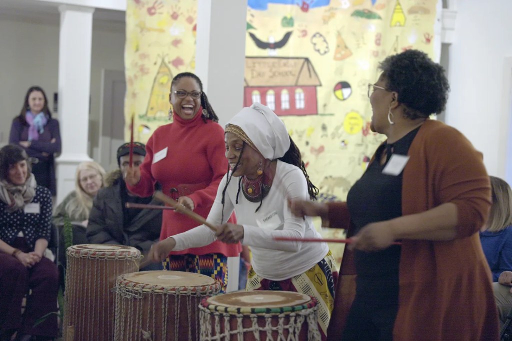 If its purpose was serious, the conference was anything but downbeat, offering a mix of social and educational strategy, art, and performance. From the start, convenor Queen Meccasia Zabriskie, the CSK Center’s director, put the 84 attendees in a convivial mood. They were there, she said, “to fortify ourselves and build out important networks of support.” A student of West African dance, she infused the program with movement, explaining, “We have to bring the body in when we talk about liberation.” Picking up a pair of drumsticks on the first evening and knocked them together in time with a Ghanaian number, “Akwaaba” (“Welcome”) performed by BabaaRitah Clark and her Columbus-based All Women’s Drum Group. Zabriskie went on to introduce the Un/Commoning Pedagogies Collective, a group dedicated to radical anti-racist approaches to teaching and learning, who at several junctures led the whole conference in exercise, meditation, and reflection.