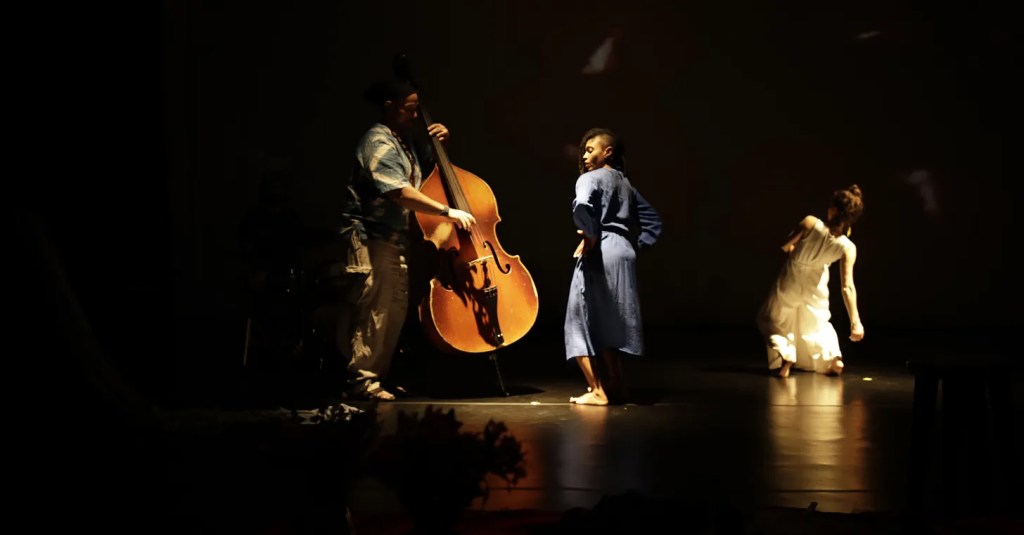 The summit departed from the typical academic-conference format with its attention to art—from giant murals and a continuous exhibit of paintings in the Herndon Gallery to multiple sessions devoted to film and video. A showstopper, Mareas/Tides, riveted a large and enthusiastic crowd at the Foundry Theater. Created and performed by dancers and musicians on the faculty of Denison University, it presents the world of the African diaspora, colonization, and native island peoples through dance, video, artifacts, song, and an improvised score based on jazz, blues, folk melodies, Gospel, and Latin salsa. A video of surf breaking on the shore beneath a giant moon fills a screen that takes up the width of the stage. Playing throughout the piece, the video makes the ocean, which once carried ships crammed with captive Africans and now surrounds and helps sustain islanders, a central player. The performance’s authenticity adds to its power. Dancer-choreographer Ojeya Cruz Banks “is inspired by her heritage as an African American and Pacific Islander from Guam/Guåhan,” the program notes state. Her colleague and creative partner, Marion Ramirez, is a Puerto Rican dance artist whose work draws on her Caribbean background and experience performing in Puerto Rico, Cuba, Europe, South Korea, and the United States.